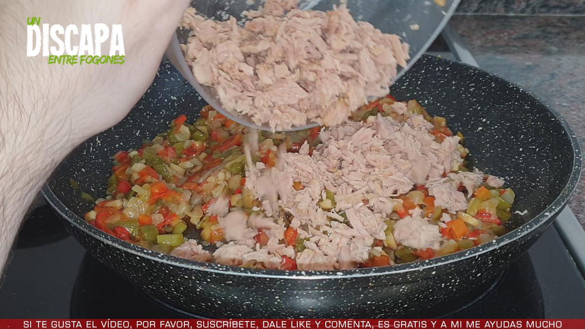 2Cuando ya tenemos la verdura bien pochada, le añadimos 2 latas de atún desmigado y bien escurrido. Mezclamos bien.