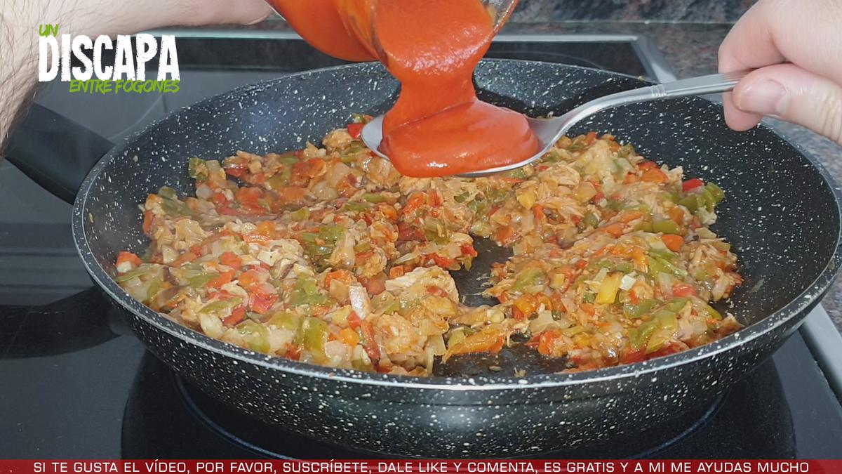 3Y a continuación le añadimos una cucharadita de pimentón y removemos. Y seguido le ponemos 2 cucharadas de salsa de tomate y volvemos a remover para que se mezcle todo de manera homogénea. Dejamos que se cocine todo conjuntamente 5 minutos y reservamos.
