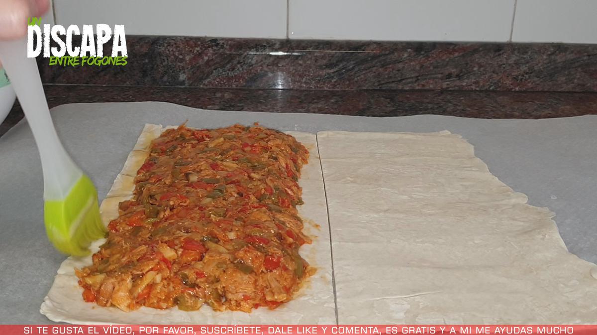 5Ahora precalentamos el horno a 190º con calor arriba y abajo. Y mientras se calienta el horno, vamos a ir estirando una lámina de hojaldre para dejarla lo más fina posible. Una vez estirada la masa, la dividimos en 2 partes lo más parecidas posible. Y sobre una de esas mitades vamos añadiendo el relleno sin llegar a los bordes. Después sobre los bordes, con la ayuda de una brocha de silicona los vamos untando con el huevo que habíamos batido anteriormente.