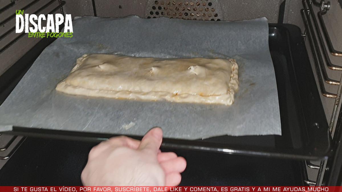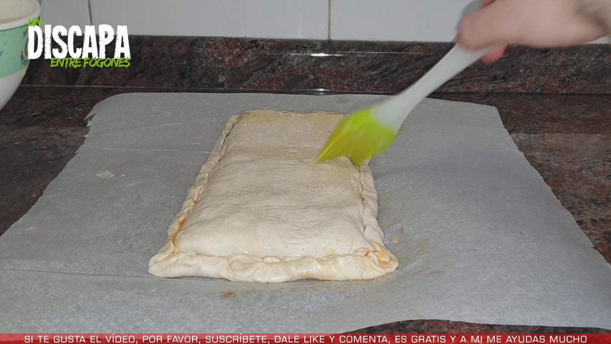 6A continuación cubrimos con la otra mitad del hojaldre y vamos doblando los bordes para evitar que el relleno se salga. Y le untamos huevo batido por encima para que coja un bonito color dorado por encima.