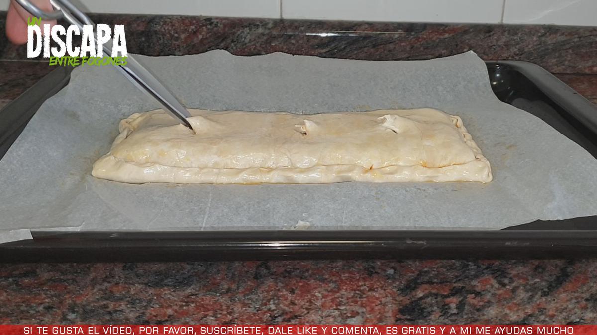 7Ahora lo ponemos sobre una bandeja de horno y antes de meterlo en el horno le hacemos unos agujeros a la empanada para que salga el vapor.