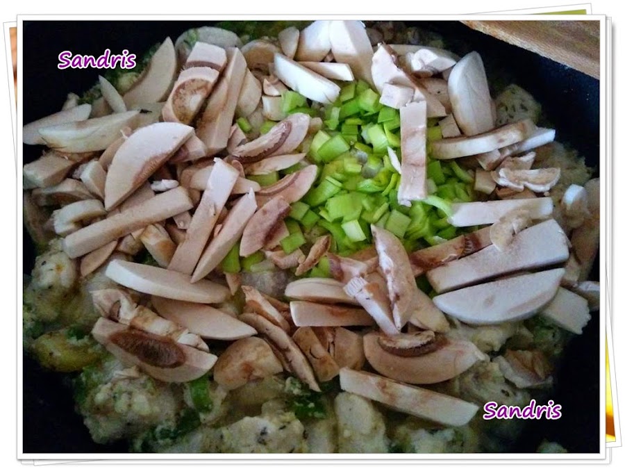 Cuando ya está marinado, se sofríe la cebolla, el pimiento verde, el pollo marinado, el puerro y los champiñones. No lo tenemos que cocinar demasiado ya que luego en el horno va a estar un buen rato y allí se terminará de cocinar.