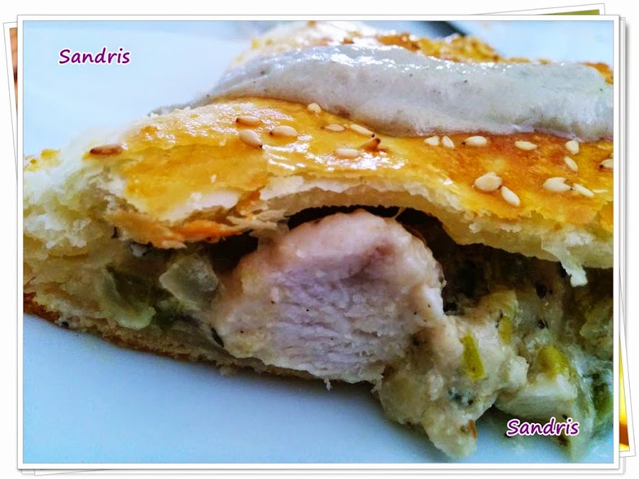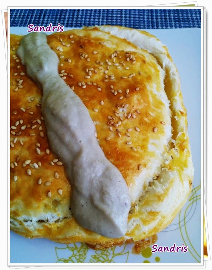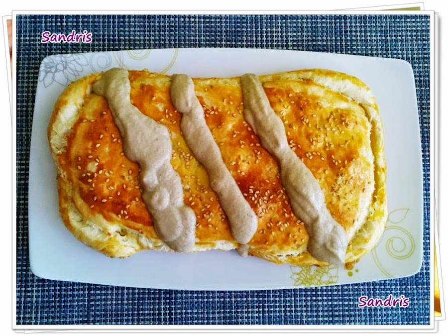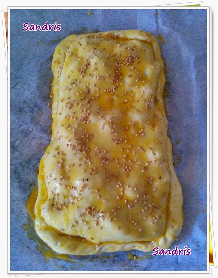 La salsa la podemos ir haciendo mientras la empanada está en el horno. Así que... extendemos la lámina de hojaldre y la partimos en dos. Si queréis una empanada más grande pues se cogen dos láminas de hojaldre, claro, pero yo esta vez la quería más bien pequeña. La pinchamos con un tenedor para que no hinche demasiado. Ponemos el relleno bastante extendido para que no quede todo en el centro y quede bastante repartido. La tapamos, la cerramos haciendo un borde (hay mil formas de cerrar una masa, se pueden hace distintos tipos de bordes o bien se cierra apretando con el dedo o con un tenedor, eso al gusto de cada uno) y la pintamos con una yema de huevo; le ponemos un poco de sésamo por encima para decorar. Y al horno a 200ºC hasta que esté bien doradita y veamos que la masa está bien hecha. En mi horno suele tardar unos 30-40 minutos, depende del horno que tengáis.