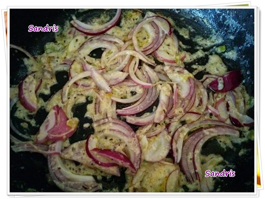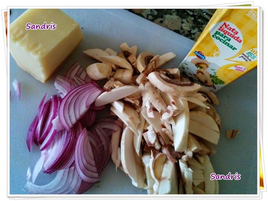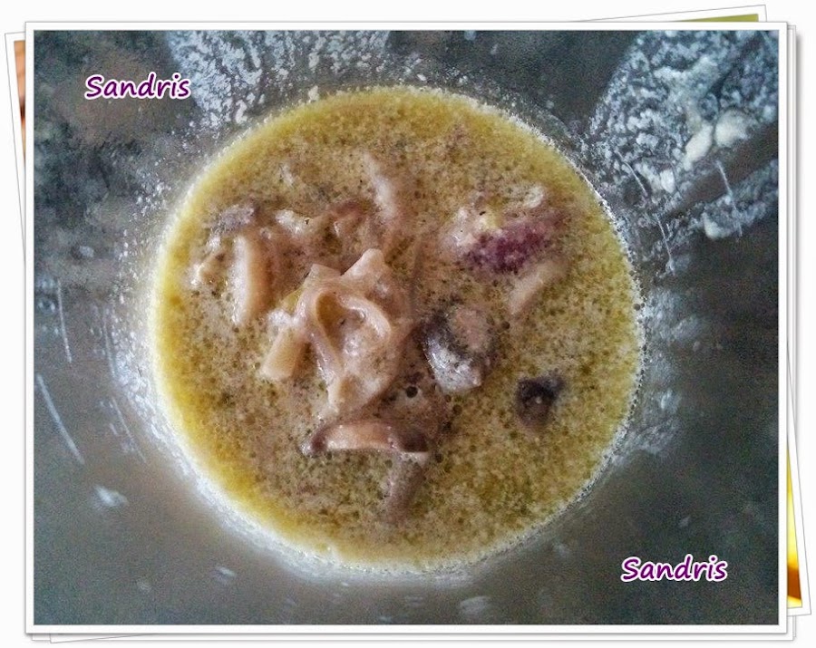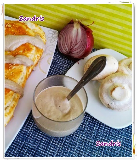 Para la salsa, he usado la misma sarten en la que he cocinado el relleno. Como ha quedado un poco de salsa del marinado, la he usado para la salsa de acompañamiento a la empanada. Ahí sofreímos la cebolla y los champiñones; cuando esté casi hecho, le agregamos la pimienta negra, la nuez moscada, la nata (crema de leche) y el queso rallado; lo cocinamos un poco más y lo pasamos a un recipiente para triturarlo. A mí la salsa se me quedó bastante fina, si hubiese quedado con trocitos, en este caso lo hubiera colado porque quería una salsa fina sin tropezones, pero si os gustan, pues ningún problema, claro está!!! :-)