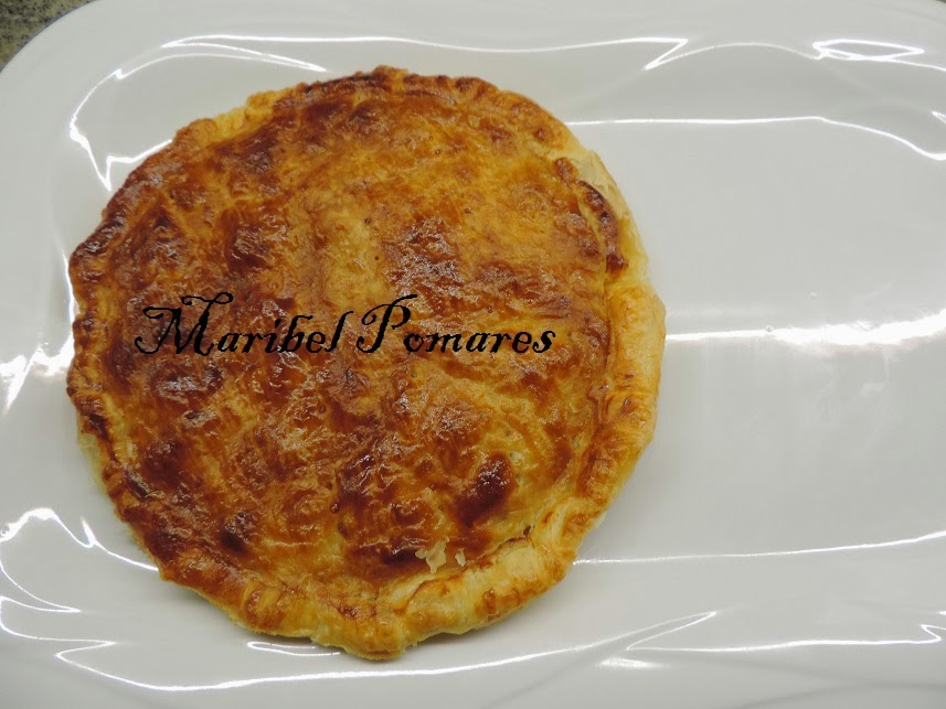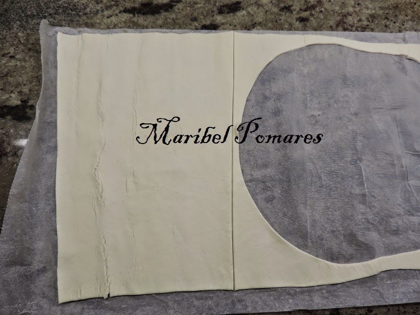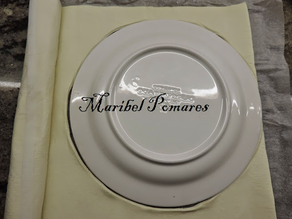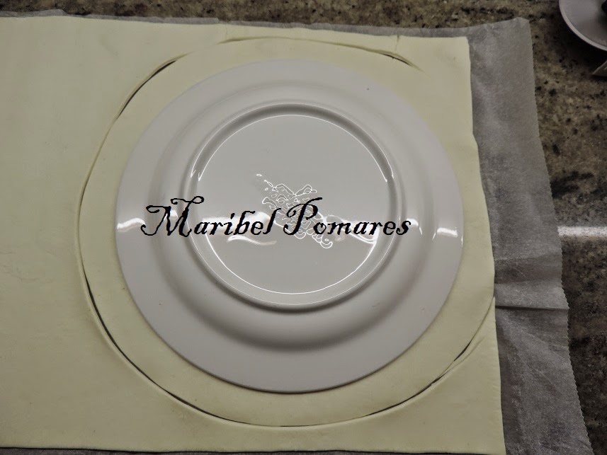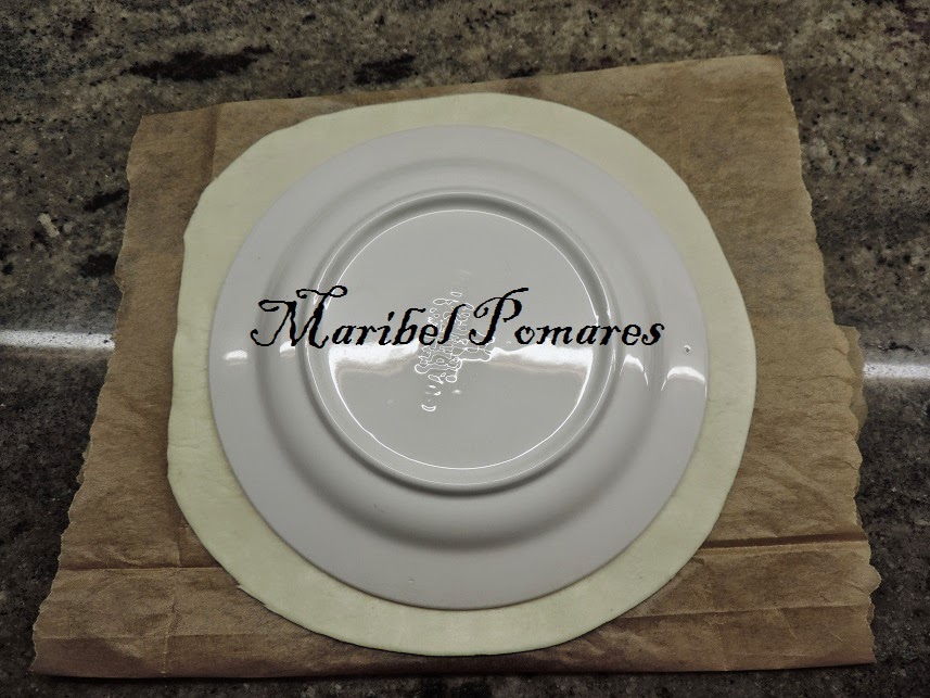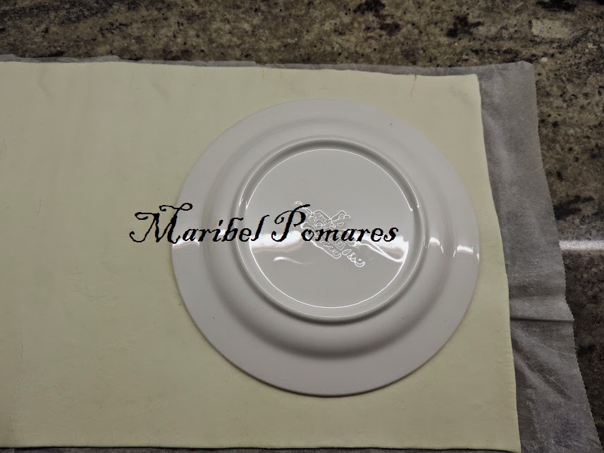 Extendemos la otra lamina de hojaldre y volvemos a poner el plato encima, para cortar la parte de arriba, del mismo tamaño que el plato.