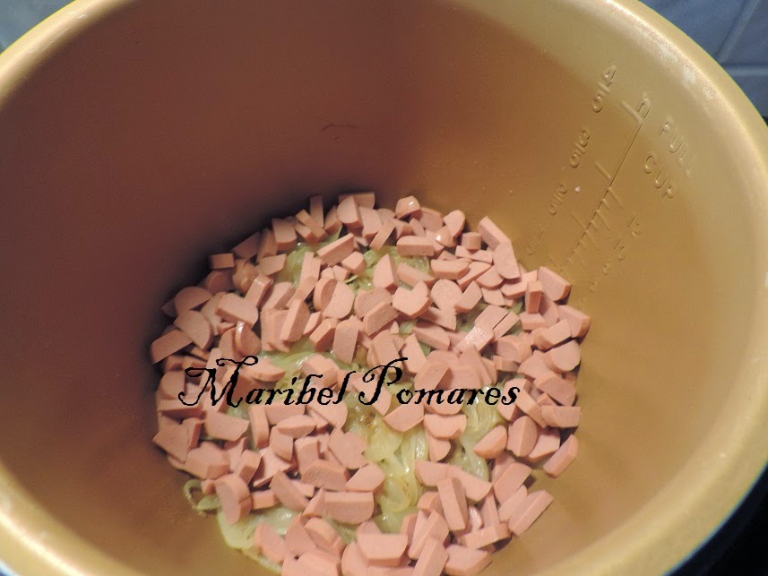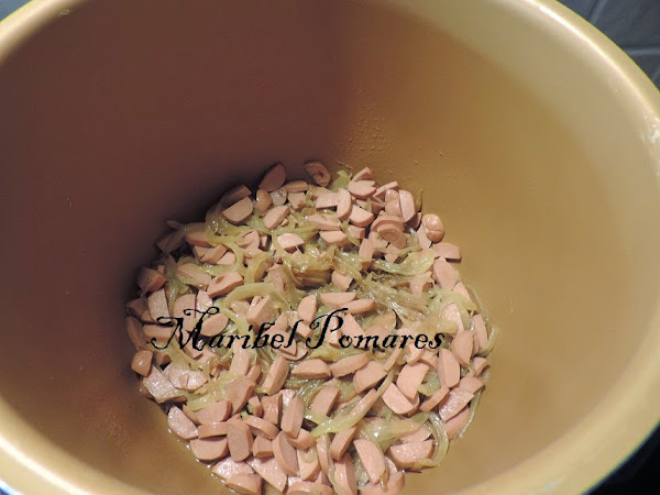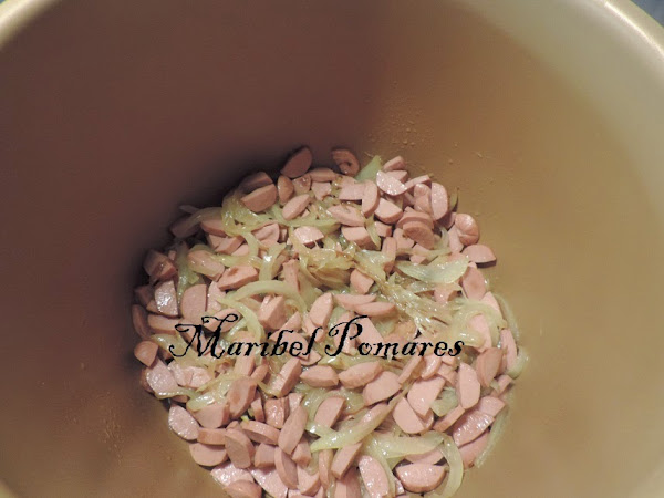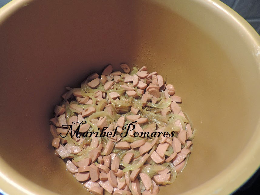 Cuando la cebolla empiece a ponerse blanca, añadimos las salchichas en trocitos.