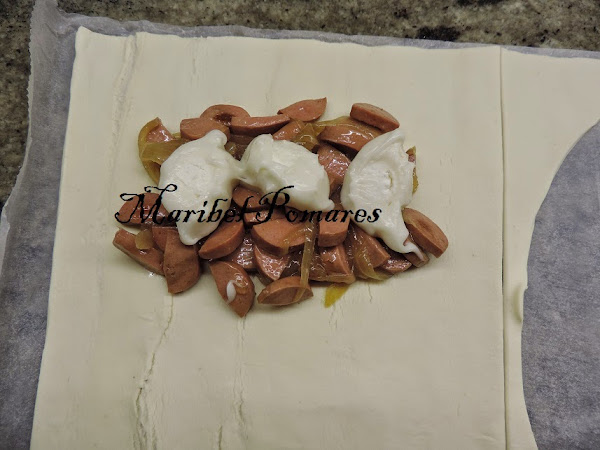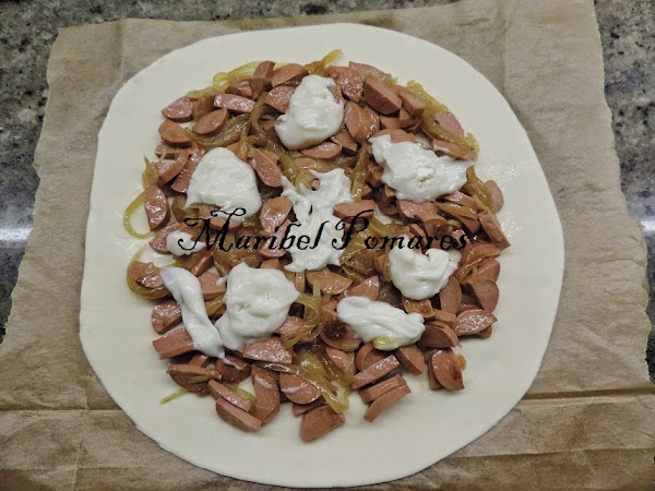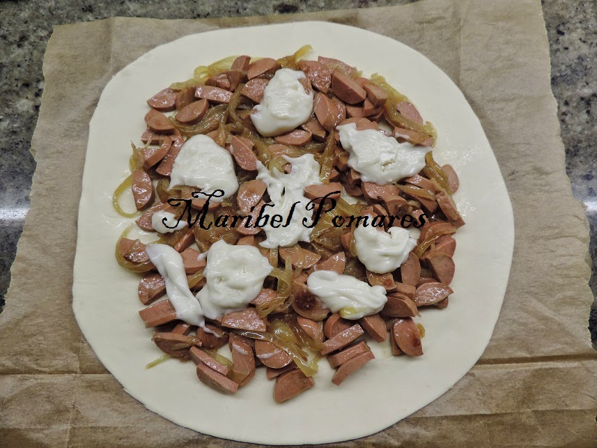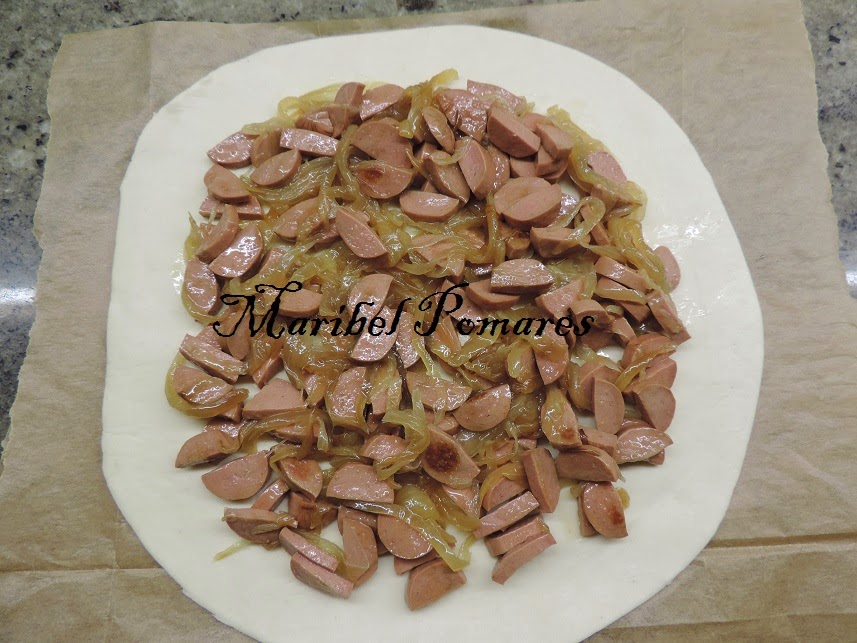 Echamos la mezcla de cebolla y salchicha encima pero dejando los bordes libres.