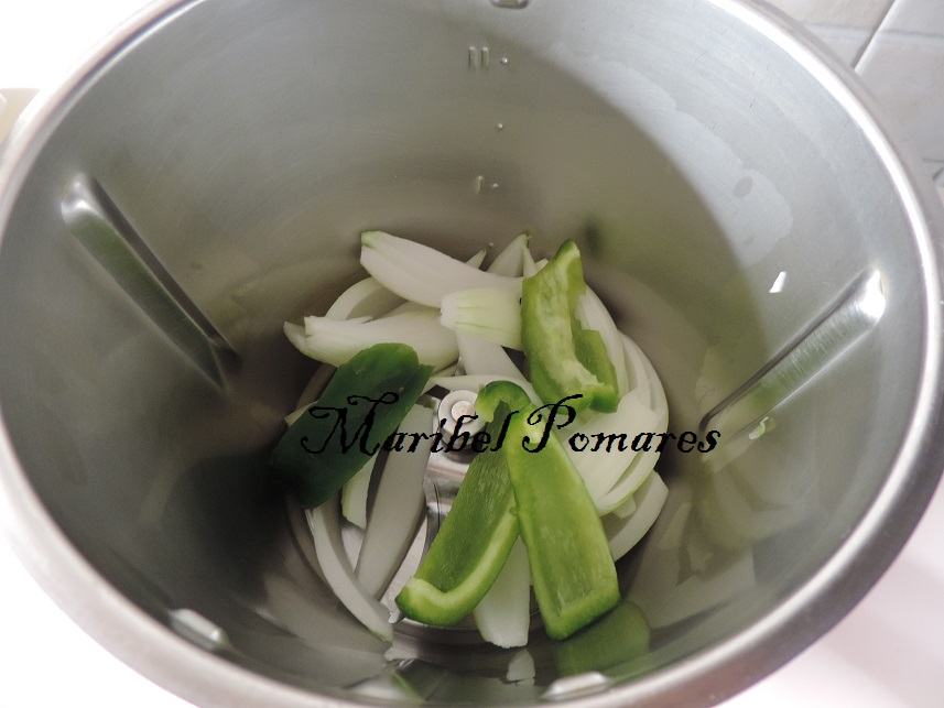 Ponemos en el vaso del thermomix la cebolla y el pimiento.