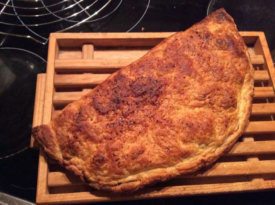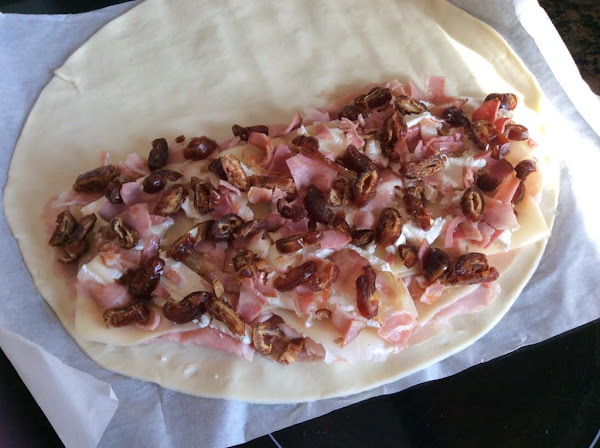 Sobre la mitad de la masa, poner las rodajas de jamón york, las lonchas de queso y el queso de cabra partido en trozos. Dejando parte del borde libre.