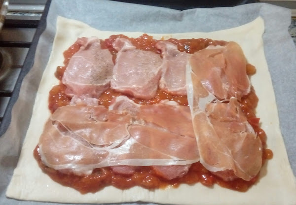 Sobre el pisto ponemos los filetes de lomo, no les eché sal pues el jamón le dará el punto de sal y el jamón encima,