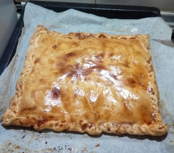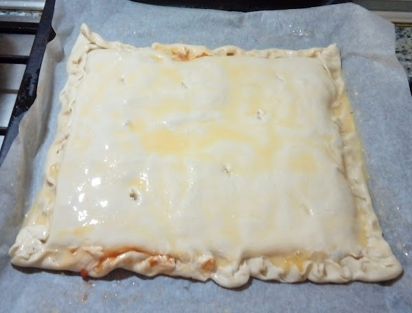 Cuando esté todo cubierto se pone la otra masa de empanada extendida encima tapandola y la pincelamos con el huevo.