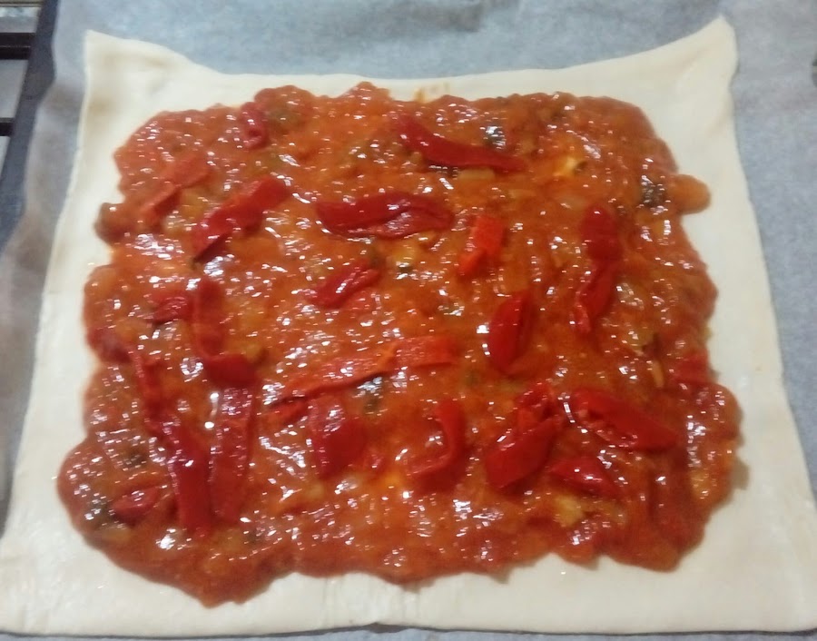 Preparamos la masa extendiendola en una bandeja de horno, se pone sobre ella el pisto,