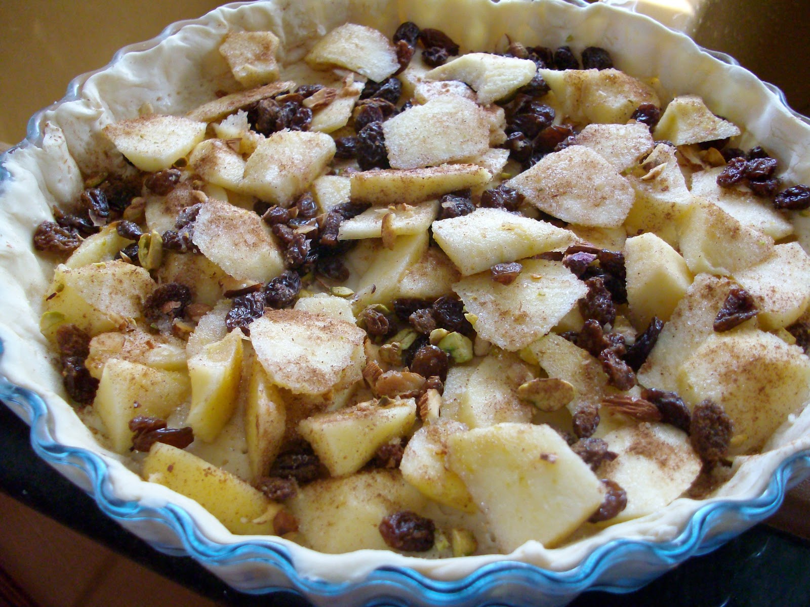 asi que ...con una lamina de masa quebrada congelada ...3 manzanas..a laminas...un paquete de frutos secos variados..(pasas....pistachos..pipas..avellanas...que vienen ya picado..de venta en mercadona)..azucar canela....y un poco de ralladura de limon...que le da un puntito alimon que le viene muy bien.