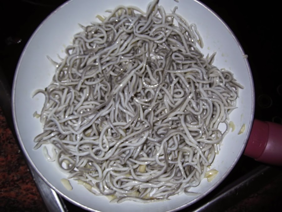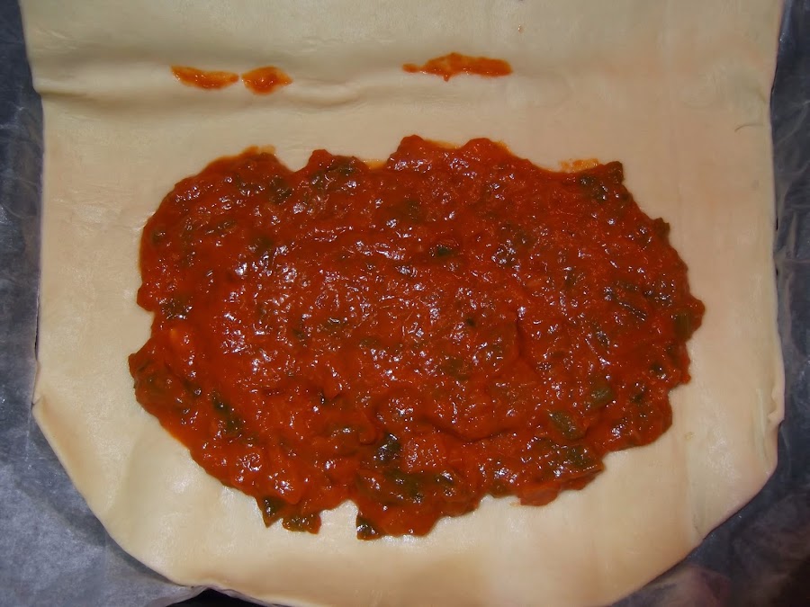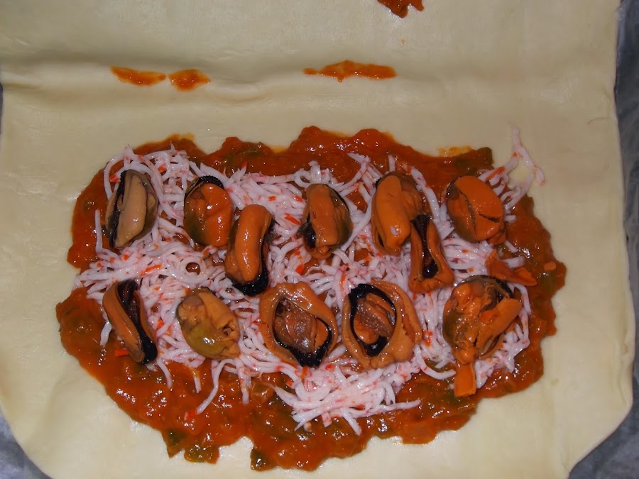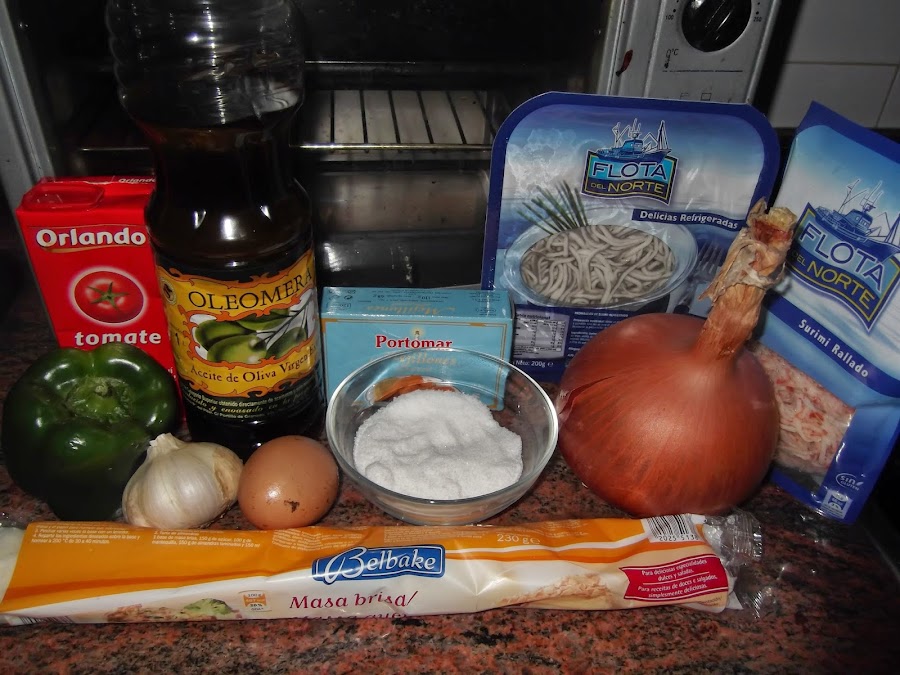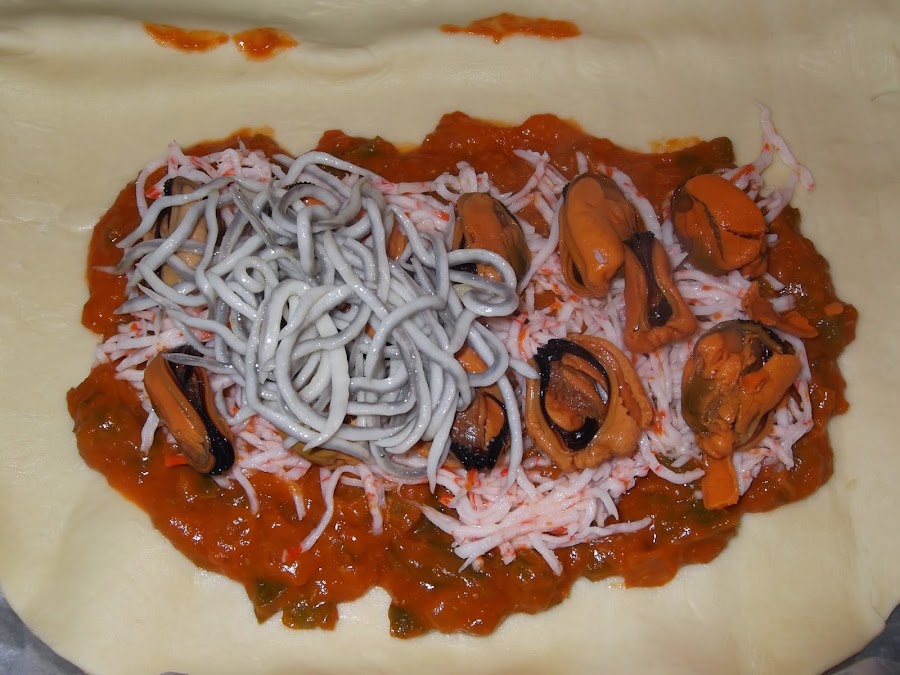 Estiramos la masa brisa y colocamos la base del sofrito. Luego ponemos encima el surimi, los mejillones y las angulas sucedáneas. Os aconsejo que las angulas sucedáneas las friáis un poquito antes de meterlas a la empanada para que estén mejor, es muy sencillo echáis un chorrito de aceite en la sartén, ponéis un par de dientes de ajo cortados en trocitos pequeños y cuando se doren echáis las angulas sucedáneas, las tenéis durante cinco minutos, las sacáis y las colocáis en la empanada. También os aconsejo que los mejillones sean naturales en vez de en escabeche, ya que si no pueden matar el resto de los sabores.