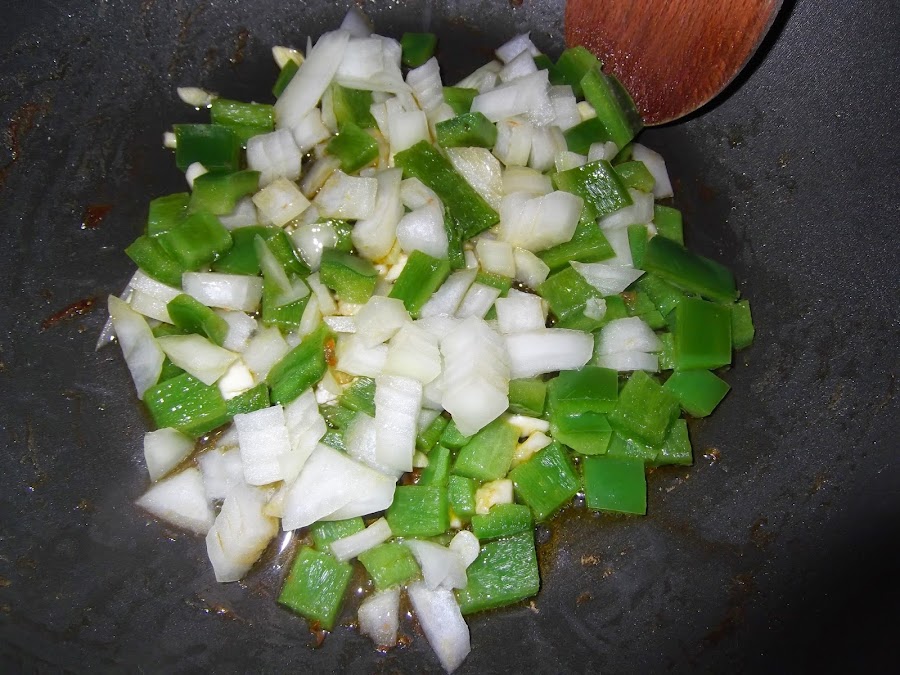 Lo primero que hacemos es echar un chorro de aceite en la sartén, picáis un par de dientes de ajo en trocitos pequeños y los echáis. A continuación, cortáis el pimiento verde y se lo añadís, lo mismo hacéis con la cebolla y lo tenéis de