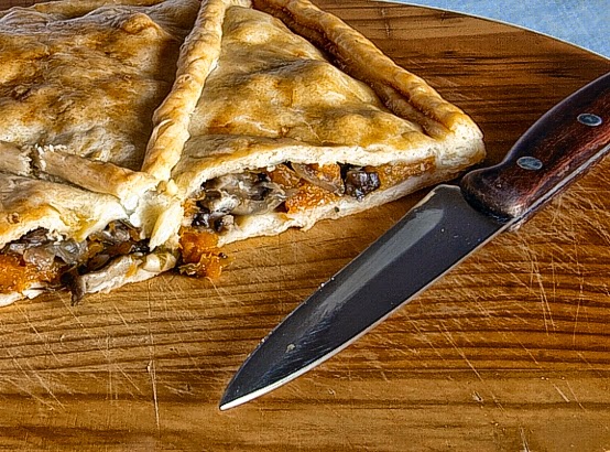 Claro, no es que vayamos a coger 400 gramos de otoño, ponerlos entre dos láminas de masa y hornearlo? pero casi. Porque para el relleno de esta empanada que hoy os propongo utilizaremos dos de los productos más ricos y representativos de la estación: la calabaza y las setas, que ya empiezan a llegar. La mezcla de sabores y texturas de estos ingredientes ligados por la cebolla y realzados por el tomillo consiguen un relleno muy jugoso y aromático al que los piñones añaden un toque crujiente muy acertado. Fácil de preparar y muy sabrosa. La masa se puede comprar ya preparada, en el mercado hay varias de excelente calidad. Pero si quiere, puede hacerla en casa, en la Red encontrará multitud de recetas para ello.