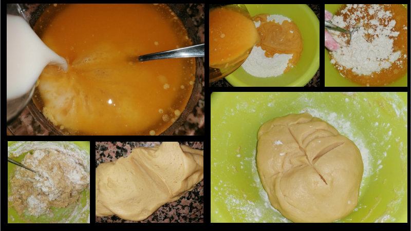 Ponemos en un balde la harina (con una pizca de sal), añadimos la mezcla de los líquidos, mezclamos y comenzamos a amasar.