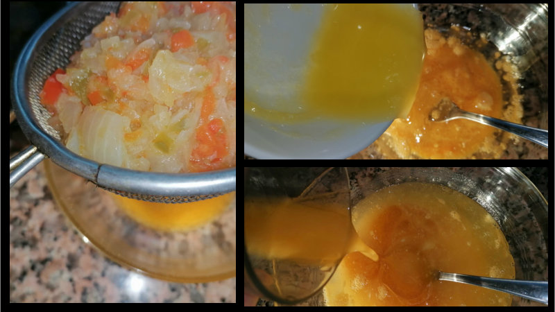 Con la ayuda de un colador colamos parte del sofrito y sacamos el líquido para utilizar en la masa.