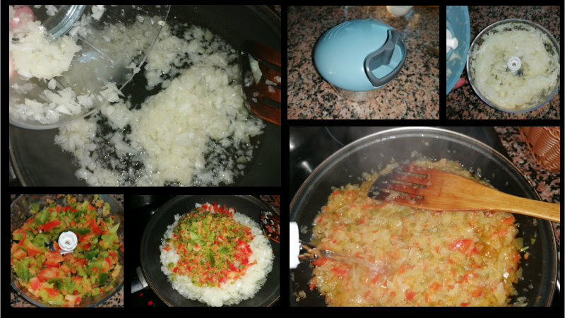 Como os dije, primero hice el sofrito, picamos muy menuda la cebolla y los pimientos, os vuelvo a dejar el enlace de esta picadora que es una maravilla, tenéis varios modelos en amazon PICADORA MANUAL sólo la había probado con cebolla, para esta receta la utilicé con pimiento y va genial, eso sí, el pimiento era recién sacado del congelador, con fresco no he probado, pero la verdad es que está genial porque lo puede dejar lo fino que quieras, en mi casa para la empanada no les gustan mucho los tropiezos grandes.