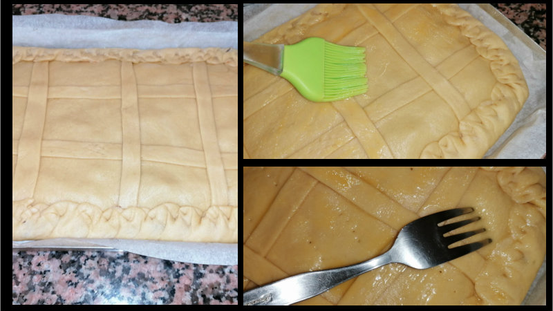 Batimos un huevo y pintamos, después pinchamos con un tenedor para que no infle al cocer, metemos al horno "precalentado", primero por abajo 10 minutos y luego ya por todo, a 180ºC, aproximadamente media hora, pero eso ya depende de cada horno