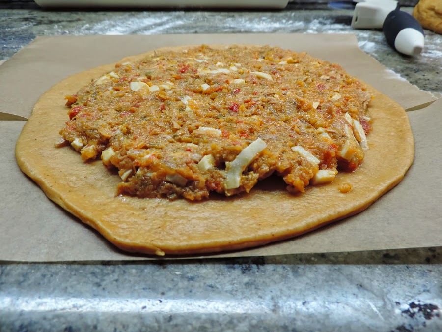 Echamos encima la mezcla de pisto, atún y huevo, dejando libre los bordes.