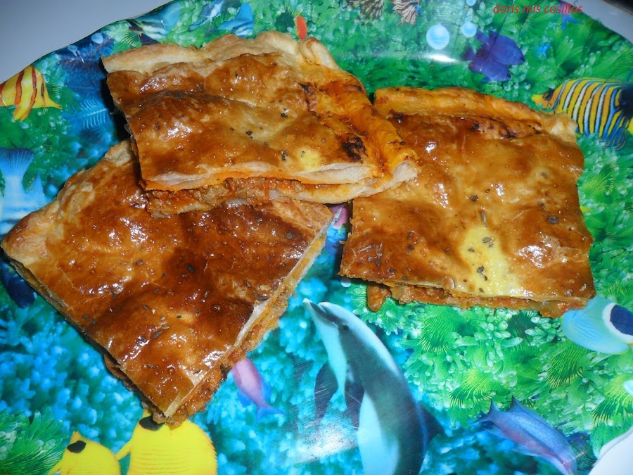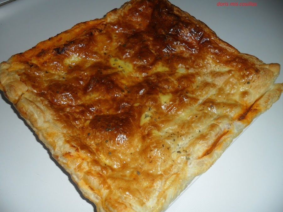 Una vez frío el relleno,extendemos dejando unos dos centímetros del borde, pincelamos con huevo batido y extendemos la segunda capa de hojaldre, pinchamos con un tenedor toda la superficie del hojaldre, pincelamos con el huevo batido restante y cerramos los bordes como si fuera un festón.