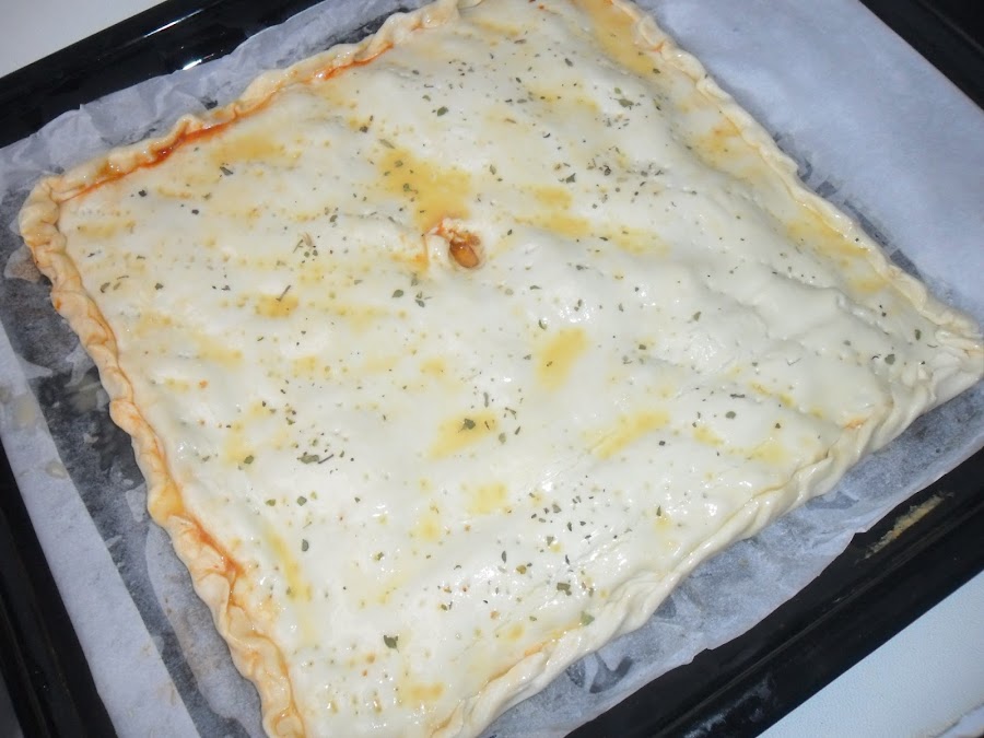 En la bandeja del horno pincelamos de aceite, forramos de papel de hornear y extendemos la primera masa de hojaldre algo estirada con un rodillo.