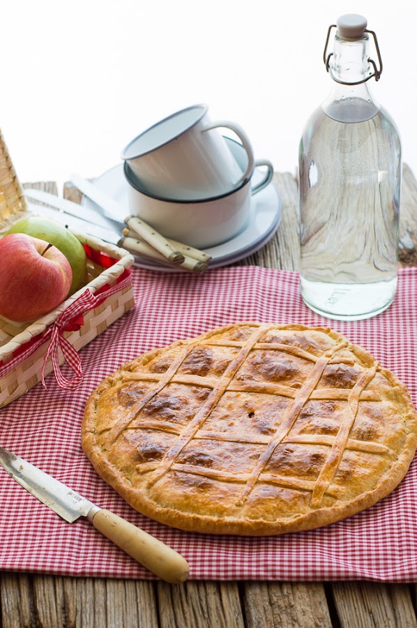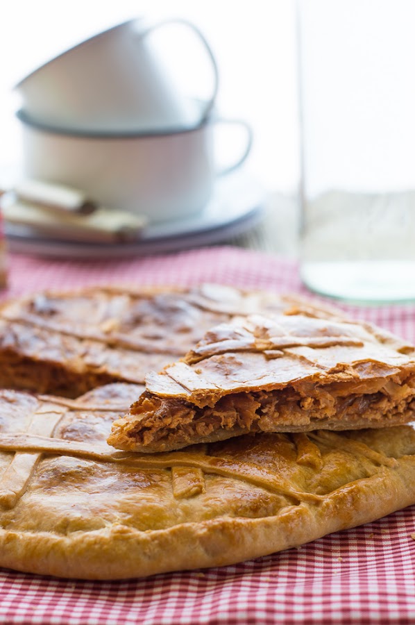 Dividimos la masa en dos, estiramos finamente una de las partes dándole forma redonda y la colocamos sobre una bandeja de horno. Ponemos el relleno por encima, pincelamos los bordes con huevo batido y cubrimos con el resto de la masa estirada. Enrollamos los bordes con los dedos, le hacemos un agujerito en el centro, decoramos con trozo de masa sobrante y pincelamos toda la superficie con huevo batido.