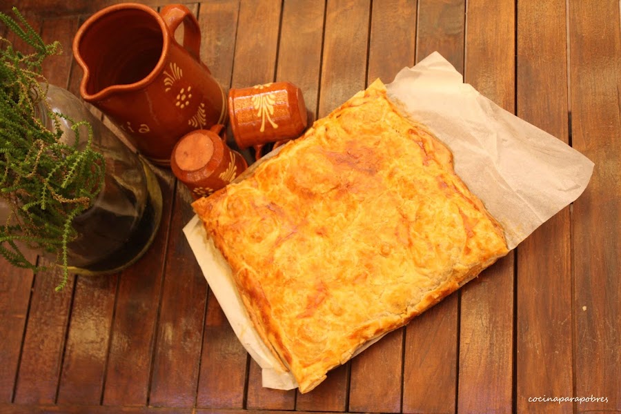 Estiramos el hojaldre sobre la bandeja del horno, previamente forrada con papel de hornear y repartimos el rellenos sobre esta, picamos los huevos y lo repartimos sobre el relleno, cubrimos con la otra lámina de hojaldre, unimos bien los bordes, pintamos la