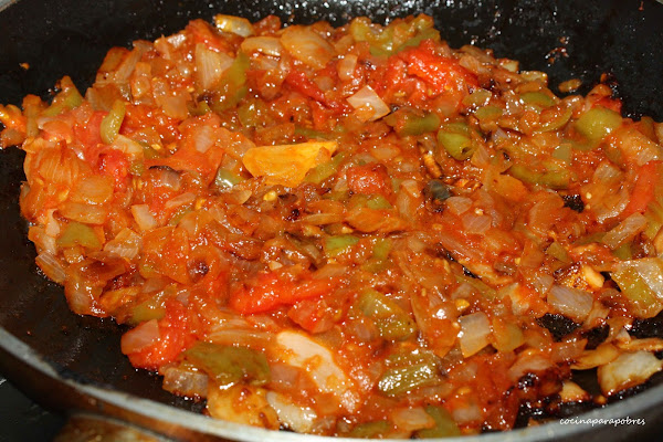 Ponemos al fuego la cebolla y el pimiento, todo bien picado, junto a un poco de aceite de oliva a fuego medio, para que vaya pochando. Cuando esté, añadimos los tomates rallados y rectificamos de sal. El sofrito debemos dejarlo con paciencia, no debe quedar nada líquido, más bien, pastoso.