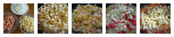 Mientras tanto, cortamos las cebollas en trozos finos y no muy grandes, la pechuga de pollo en cuadraditos y pelamos y cortamos las patatas en cuadrados.
