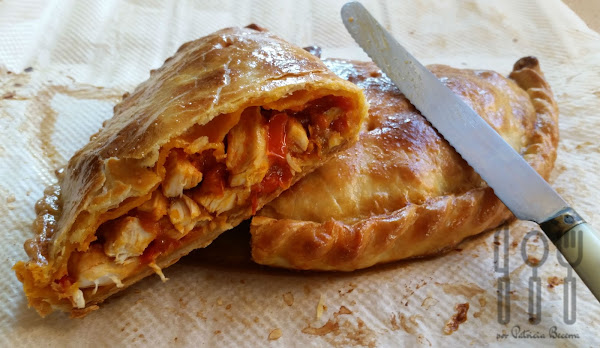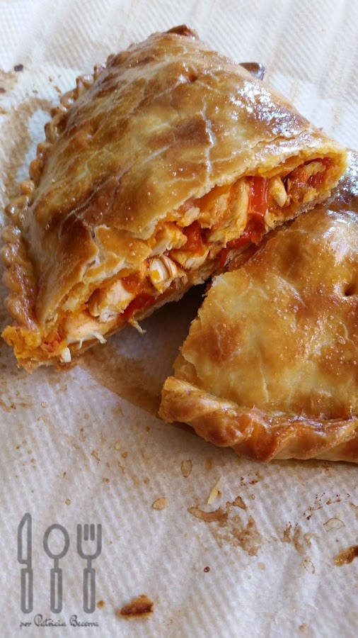 Extendemos el relleno sobre la mitad de la masa y lo cubrimos con la otra mitad. Sellamos bien los bordes, pinchamos con el tenedor y pintamos con un huevo batido.