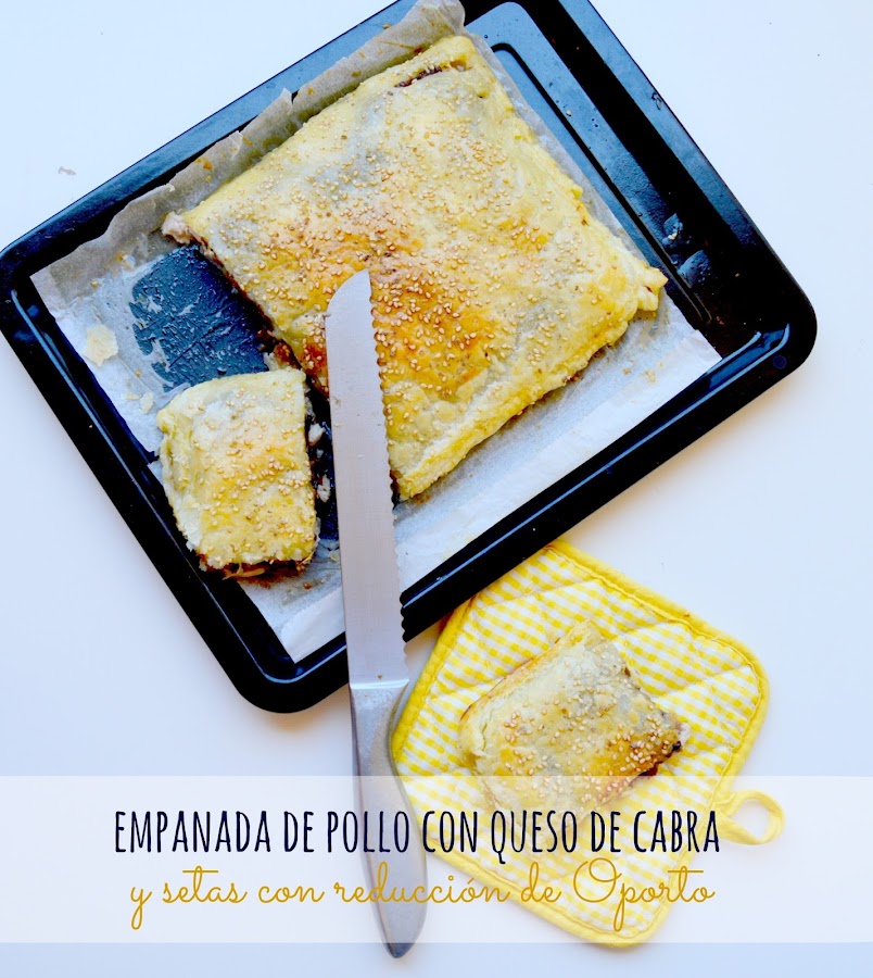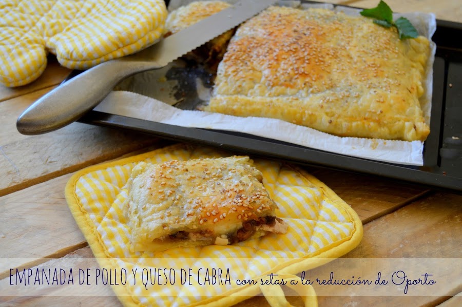 Extendemos en una bandeja de horno sobre un papel vegetal (especial para horno) la primera plancha de hojaldre y sobre ella extendemos las pechugas de pollo fileteadas y cortadas en tiras o tacos´y las salpimentamos. Sobre el pollo disponemos la mermelada de setas con reducción de Oporto y las rodajas del queso de cabra. Cerramos la empanada poniendo encima la otra plancha de hojaldre y con ayuda de un tenedor cerramos los bordes y la decoramos. Batimos un huevo y con ayuda de un pincel lo extendemos sobre la superficie del hojaldre para que luego quede dorado. A mi me gusta ponerle por encima semillas de sésamo y sal de boletus, aunque esto ya va al gusto de cada uno.