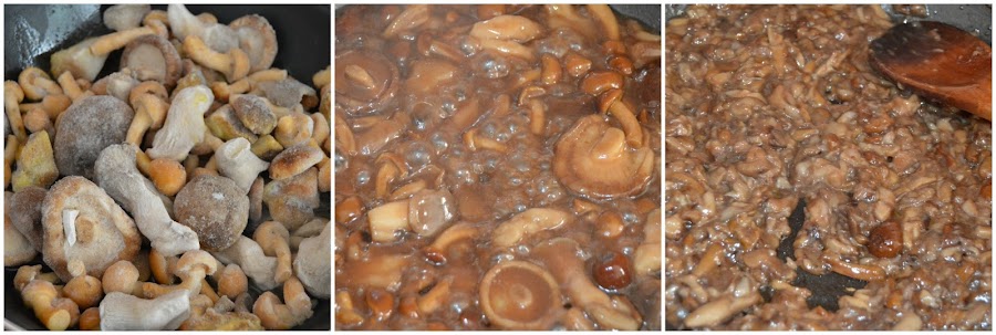 Primero vamos ha preparar la "mermelada" de setas a la reducción de oporto. En una sartén sofreímos las setas hasta que estén cocinadas, le añadimos el vaso de Oporto y dejamos que reduzca hasta que nos queden las setas con una textura parecida a la de las mermeladas. Si queremos que quede más suave, podemos triturarlas hasta que nos quede con el espesor que más nos guste.