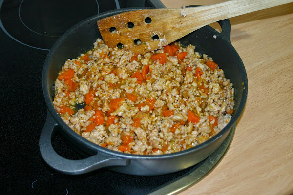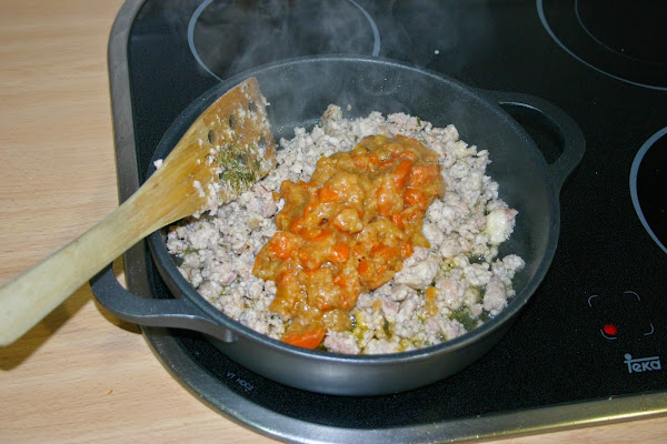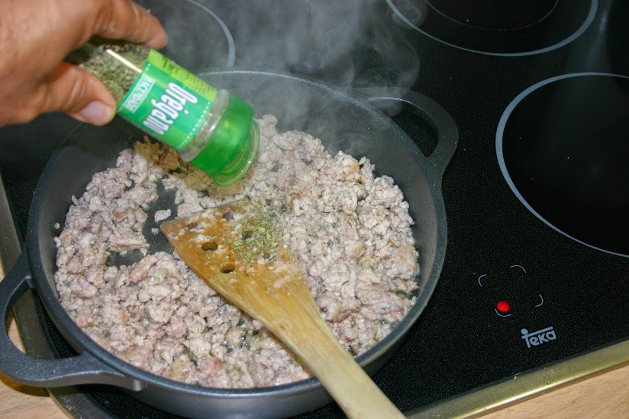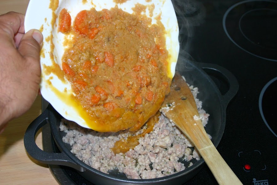 y echamos la carne dentro, sal pimentamos y lo freimos