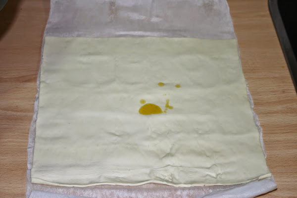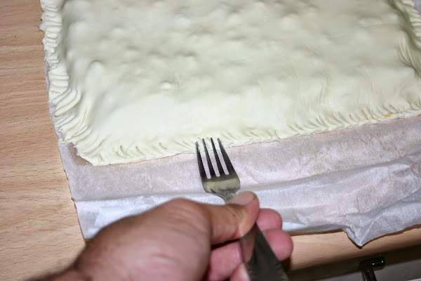 con un tenedor y con cuidado pinchamos el hojaldre para que cuando cueza salga el vapor y no se abulte