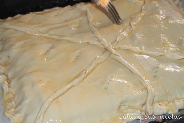 Cubrimos con la otra lámina de hojaldre y sellamos los bordes. La pintamos con el huevo batido.