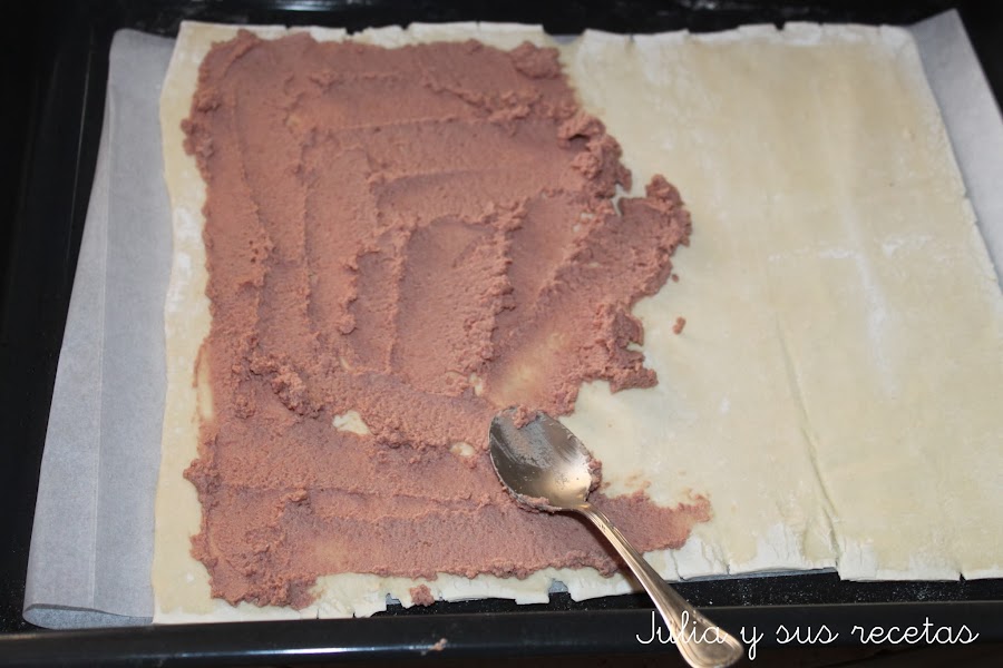 en la bandeja de horno ponemos un papel vegetal y encima una plancha de hojaldre un poco estirada con el rodillo.
