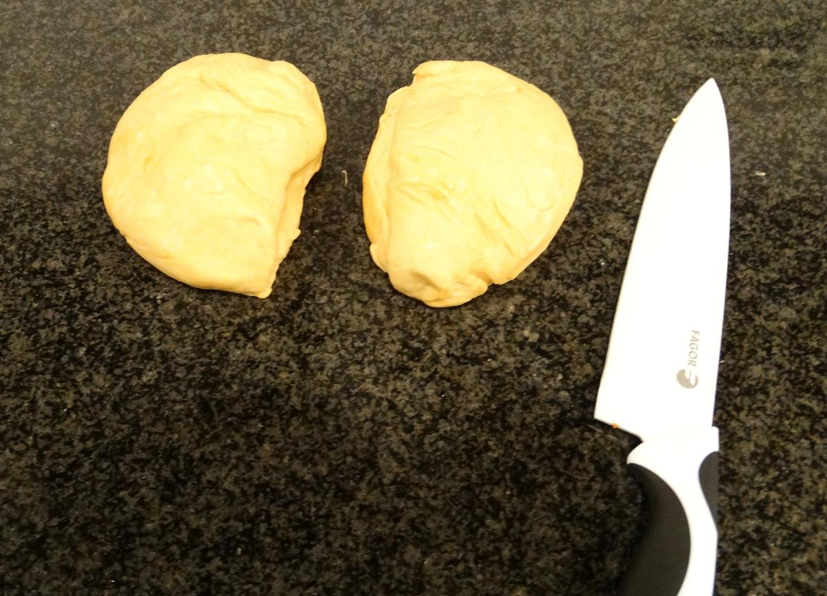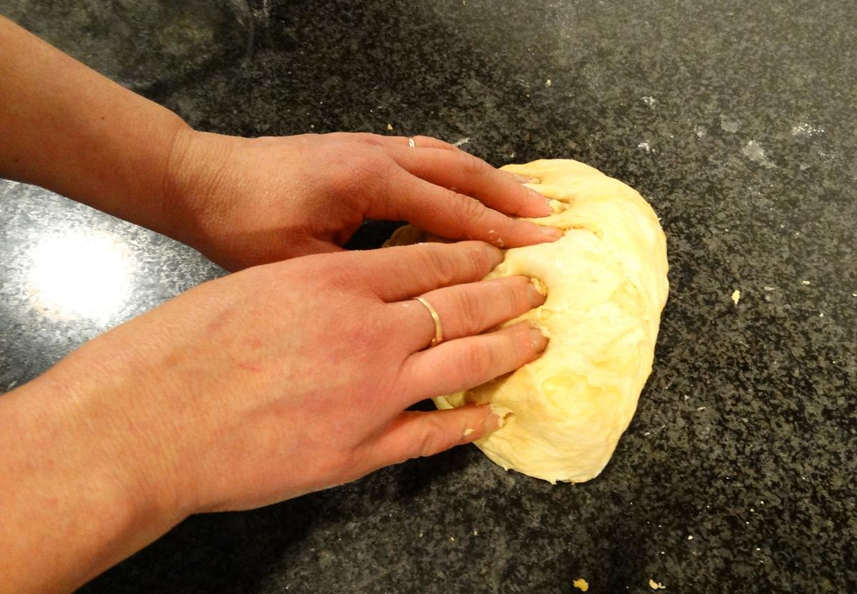 Enharinamos ligeramente la superficie de la mesa donde vamos a trabajar y nos ponemos “manos a la masa” con entusiasmo durante unos cuantos minutos, hasta conseguir una masa homogénea y elástica.