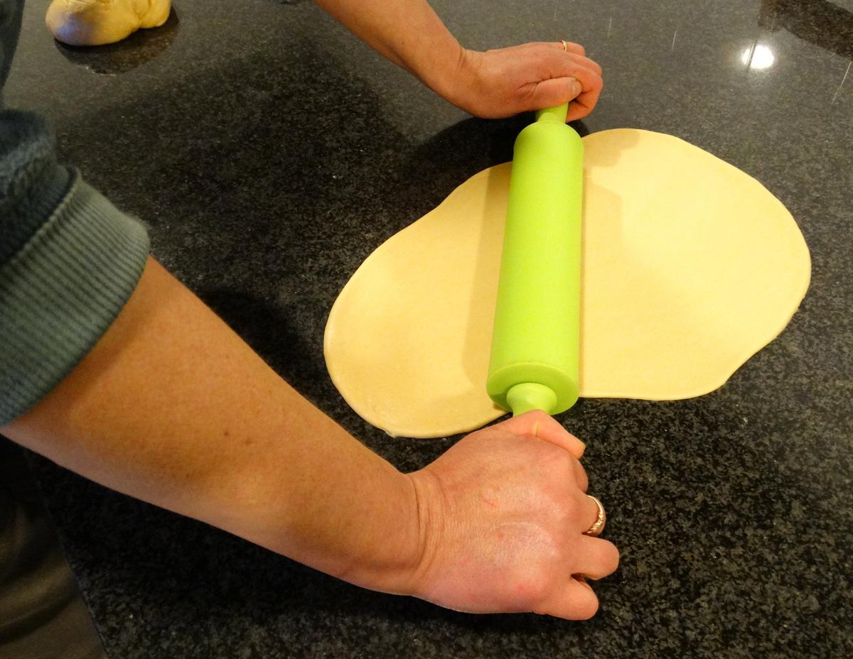 Transcurrido ese tiempo, volvemos a amasar con la yema de los dedos un momento y después partimos la masa en dos mitades. Estiramos la primera de ellas con un rodillo dejándola lo más fina posible sin romperla.