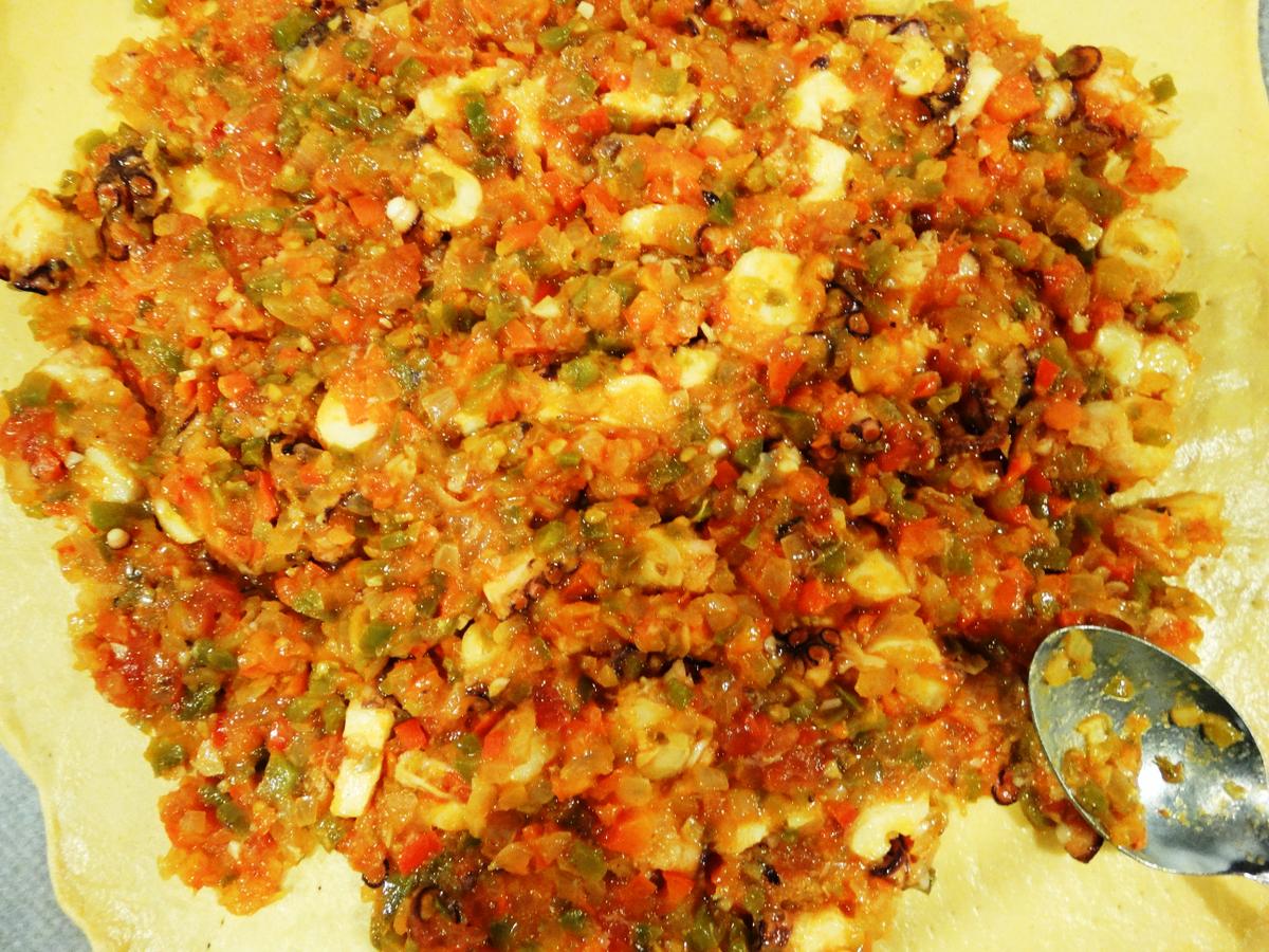 La colocamos con cuidado sobre la bandeja del horno o sobre el molde que vayamos a emplear, y extendemos sobre esta base el relleno que teníamos reservado, procurando dejar libre el borde.