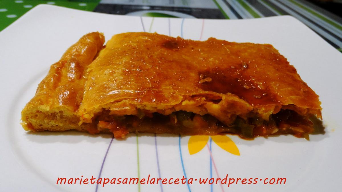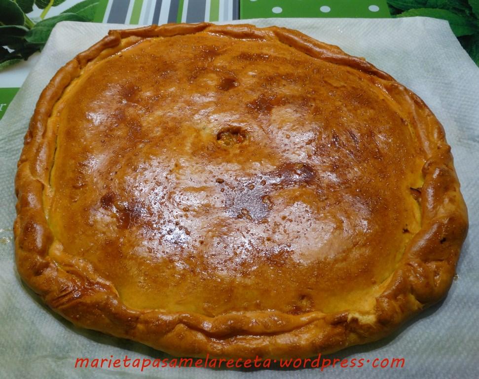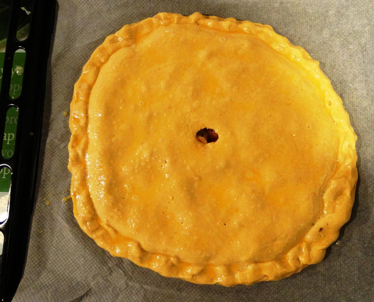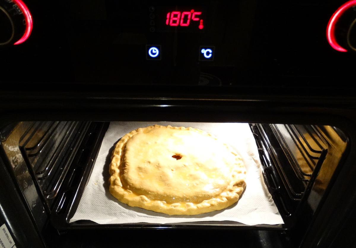 Estiramos la otra mitad de la masa y cubrimos con ella el relleno. Unimos los bordes para sellar nuestra empanada, le hacemos un pequeño agujero en el centro a modo de chimenea para que respire, y la pincelamos con huevo batido. Y ya sólo tenemos que hornearla a 180 º durante 40/45 minutos (calor arriba y abajo) hasta que esté doradita.