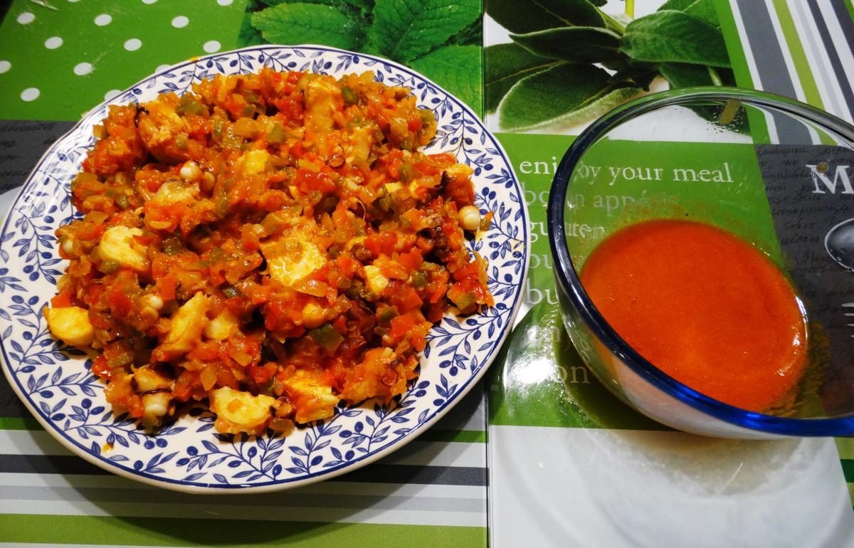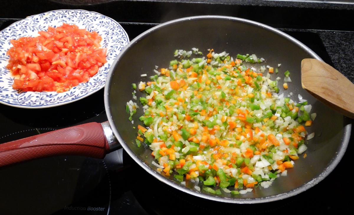Comenzamos picando finamente todas las verduras. Ponemos la sartén a fuego medio con un fondo de buen aceite de oliva y cuando esté caliente las rehogamos unos minutos, excepto el tomate que lo incorporaremos más tarde. Sazonamos.