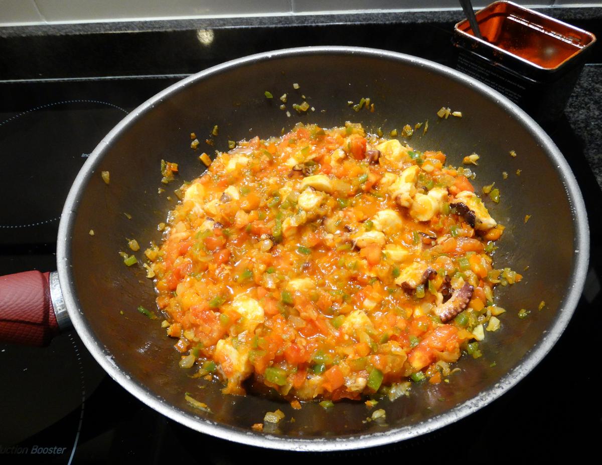 Cuando la cebolla esté transparente añadimos el pimentón dulce y el tomate muy picadito, le damos un par de vueltas e incorporamos el pulpo que habremos cortado en trozos pequeños. Rehogamos todo unos minutos más y rectificamos de sal si fuese necesario.