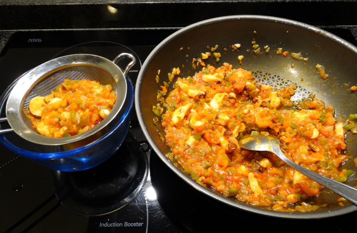 Pasaremos por el colador nuestro sofrito para escurrirlo bien y aprovechar el aceite para emplearlo en la masa.