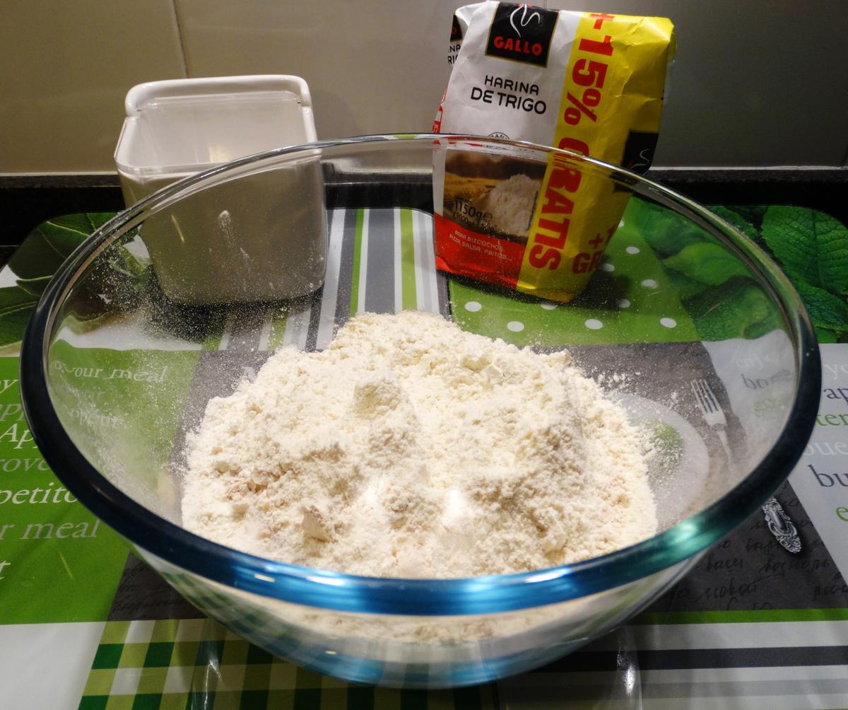 Vamos ahora a preparar la masa. Ponemos la harina en un bol, agregamos la sal (una cucharada +/-) y la levadura desmenuzada. Removemos y vamos añadiendo despacio el agua templada y el aceite del rustido. Mezclamos bien hasta que podamos seguir amasando con las manos.