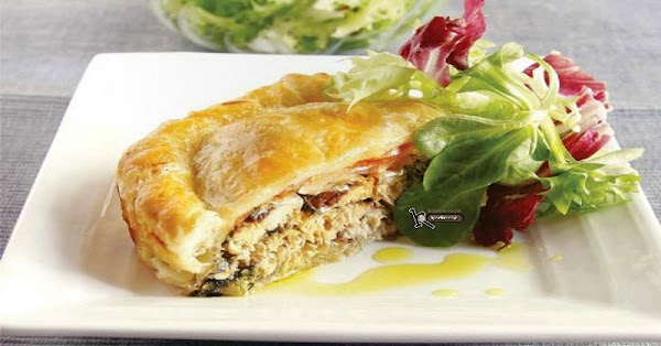 Batir el huevo y pintar el hojaldre. Practicar un agujerito en el centro de la masa para que respire. Meter la bandeja en el horno. Pasados 5 minutos, reducir a 200 °C y cocer otros 30 min. Dejarla enfriar y servir.