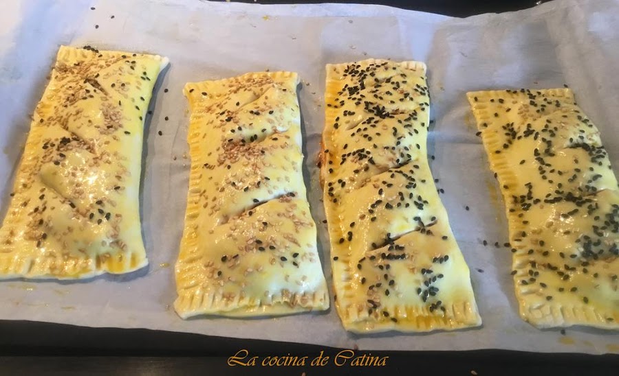 Pasamos las empanadas a una bandeja de horno recubierta con papel sulfurizado y las pintamos con huevo batido antes de introducirlas en el horno. Espolvoreamos ligeramente con semillas de sésamo por encima de las empanadas.