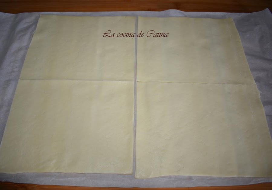 Colocamos la masa de empanada estirada sobre la superficie de trabajo y con un cuter hacemos 4 partes dividiendo la masa a lo largo y a lo ancho por la mitad.