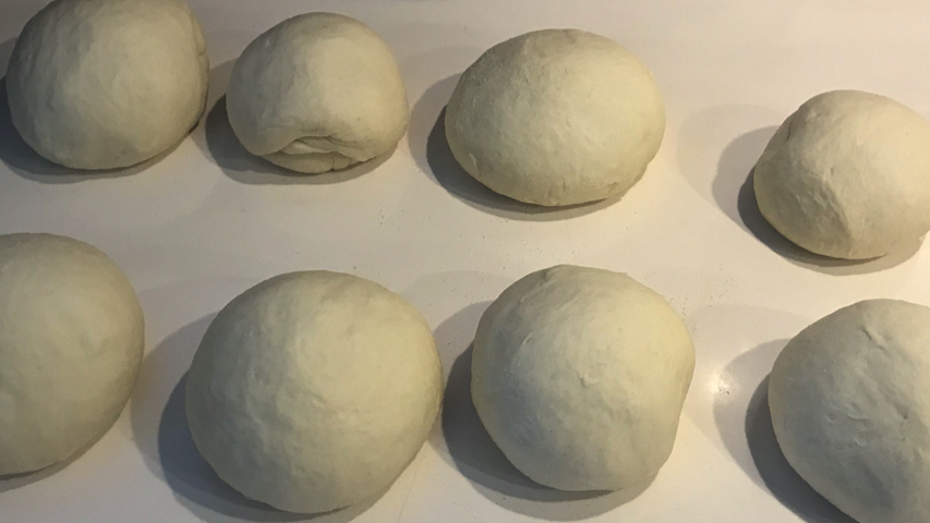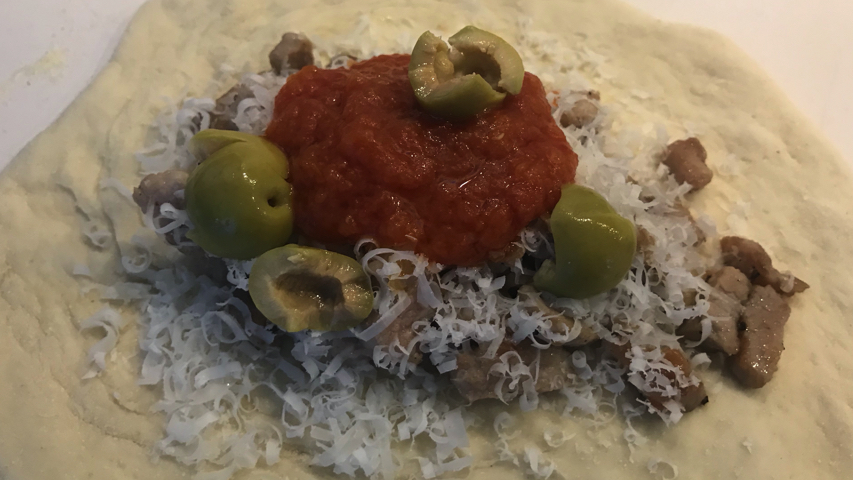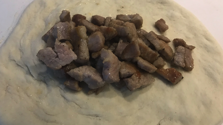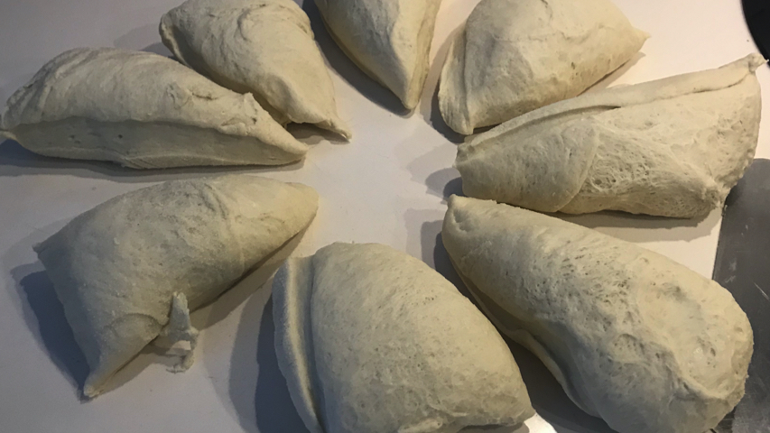 Prepara una masa de pan, divide en trozos según el tamaño que quieras para las empanadas, bolea y aplasta, a mano o con el rodillo, dándoles forma circular.